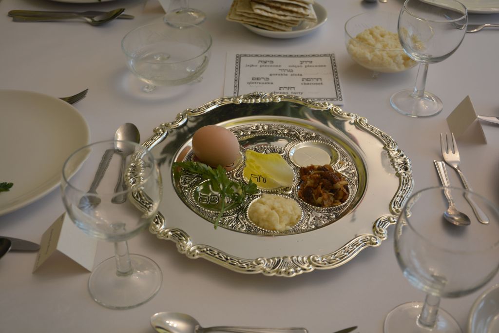 Stół do Sederu przygotowaliśmy w erew Pesach, czyli w dzień poprzedzający wieczór sederowy. Na stole, który przybraliśmy białym obrusem, świecami i kwiatami, pojawiły się: zeroa (biała hostia, symbol Jezusa Chrystusa jako Baranka Bożego), maror (tarty chrzan), karpas (nać zielonej pietruszki, symbolizująca hizop, którym Izraelici naznaczali odrzwia) i naczynie ze słoną wodą ‒ symbol gorzkiego życia Żydów w niewoli i smaku łez, a także bejca (jajko ugotowane na twardo, a później opieczone w skorupie w piekarniku, jako symbol zbiorowego losu narodu, płodności i woli przetrwania w Egipcie), charoset (potrawa z tartych jabłek, kruszonych migdałów i orzechów ‒ ma ona przypominać glinę wymieszaną ze słomą, z której wyrabiano cegły w Egipcie, oraz symbolizować słodkie, otumaniające odurzenie monotonią niewolniczej pracy), chazeret (sałata) oraz trzy mace przykryte ozdobną serwetką.