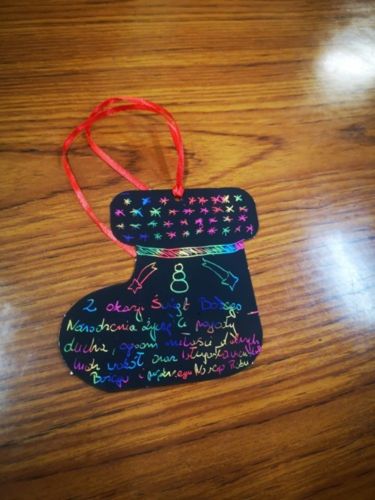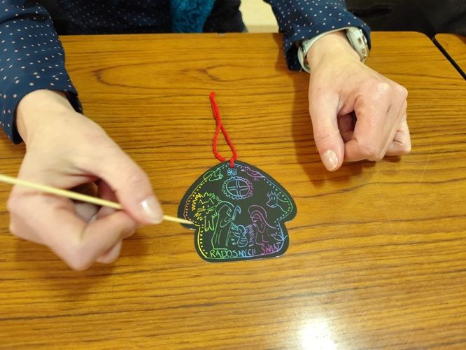 Rozpoczęliśmy cichą adoracją Najświętszego Sakramentu, po niej celebrowaliśmy roratnią Eucharystię, modląc się m.in. w intencji grudniowych solenizantów. Potem w auli w ramach przedświątecznej twórczości wydziergaliśmy... wyjątkowe zdrapki z życzeniami na Boże Narodzenie - jedni bardziej literacko, inni malarsko. Wzajemnie się nimi obdarowaliśmy - zgodnie z kierunkiem "prawy do lewego";)